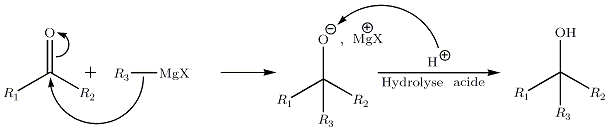 - R'-CO-R + RMgX → R-R'COMgX-R et sous l'action de H2O, on obtient un alcool tertiaire.