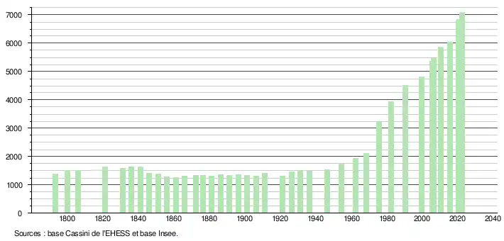 L'évolution du nombre d'habitants est connue à travers les recensements de la population effectués dans la commune depuis 1793. Pour les communes de moins de 10 000 habitants, une enquête de recensement portant sur toute la population est réalisée tous les cinq ans, les populations de référence des années intermédiaires étant quant à elles estimées par interpolation ou extrapolation[34]. Pour la commune, le premier recensement exhaustif entrant dans le cadre du nouveau dispositif a été réalisé en 2005[35].
