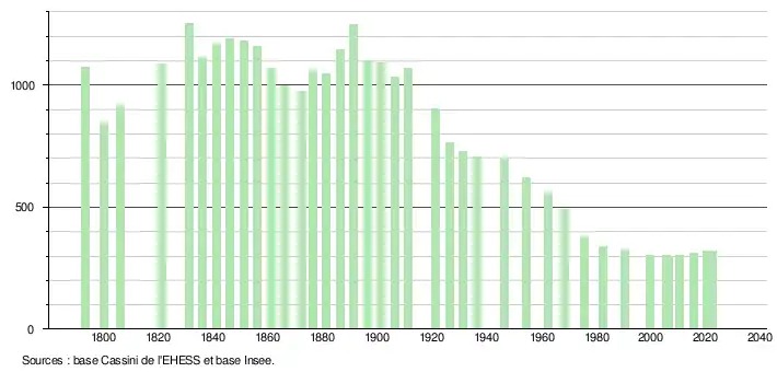 L'évolution du nombre d'habitants est connue à travers les recensements de la population effectués dans la commune depuis 1793. Pour les communes de moins de 10 000 habitants, une enquête de recensement portant sur toute la population est réalisée tous les cinq ans, les populations de référence des années intermédiaires étant quant à elles estimées par interpolation ou extrapolation[26]. Pour la commune, le premier recensement exhaustif entrant dans le cadre du nouveau dispositif a été réalisé en 2005[27].