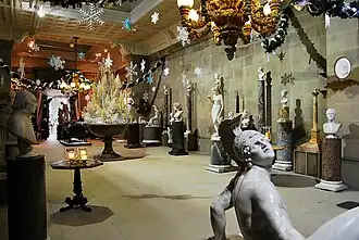 La caméra suit en vue aérienne la voiture des Gardiner, puis montre Elizabeth, seule, en plongée et en plan d'ensemble, arpentant le corridor carrelé, les yeux levés vers le plafond en trompe-l'œil. Elle la suit ensuite dans la Galerie des sculptures[N 3], remplie de statues de marbre, parmi lesquelles elle déambule lentement, frôlant leurs rondeurs de la main[9]. Elle s'arrête devant un buste de Darcy qu'elle contemple longuement et avec intensité, étonnée par les révélations de l'intendante. Plus tard, elle s'avance, seule encore, plus avant dans le château, l'air rêveur, de plus en plus troublée d'être dans cette demeure qui aurait pu devenir la sienne. Entrant dans un salon luxueux, elle entend jouer du piano. Curieuse, elle entrouvre la porte d'où la musique semble provenir, et aperçoit dans un miroir le reflet de la pianiste, une mince jeune fille. Pendant qu'elle l'observe, elle voit Darcy, de dos, venir surprendre sa sœur, lui manifestant son affection avec beaucoup de spontanéité[8]. Elizabeth, surprise, gênée, consciente de son indiscrétion, lâche brutalement la poignée de la porte[N 4]. Il se retourne, la voit se sauver, la rattrape sur une terrasse et se montre alors si courtois et amical qu'elle en est profondément troublée, et lui précise, avant de partir, à pied, qu'elle voyage avec son oncle et sa tante et qu'ils séjournent à l'auberge.