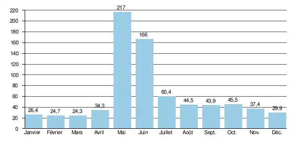 En ce qui concerne la période estivale, la plus importante car libre de glaces (de mai à septembre inclus), le débit minimal observé a été de 26,5 m3/s en , ce qui restait bien confortable.
