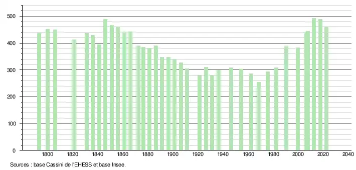 L'évolution du nombre d'habitants est connue à travers les recensements de la population effectués dans la commune depuis 1793. Pour les communes de moins de 10 000 habitants, une enquête de recensement portant sur toute la population est réalisée tous les cinq ans, les populations de référence des années intermédiaires étant quant à elles estimées par interpolation ou extrapolation[21]. Pour la commune, le premier recensement exhaustif entrant dans le cadre du nouveau dispositif a été réalisé en 2007[22].