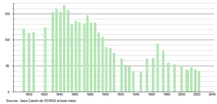 L'évolution du nombre d'habitants est connue à travers les recensements de la population effectués dans la commune depuis 1793. Pour les communes de moins de 10 000 habitants, une enquête de recensement portant sur toute la population est réalisée tous les cinq ans, les populations de référence des années intermédiaires étant quant à elles estimées par interpolation ou extrapolation[15]. Pour la commune, le premier recensement exhaustif entrant dans le cadre du nouveau dispositif a été réalisé en 2007[16].