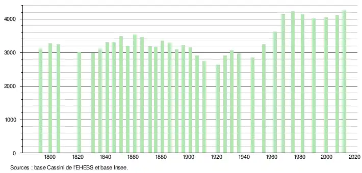 - ↑ Par convention dans Wikipédia, le principe a été retenu de n’afficher dans le tableau des recensements et le graphique, pour les populations légales postérieures à 1999, que les populations correspondant à une enquête exhaustive de recensement pour les communes de moins de 10 000 habitants, et que les populations des années 2006, 2011, 2016, etc. pour les communes de plus de 10 000 habitants, ainsi que la dernière population légale publiée par l’Insee pour l'ensemble des communes.