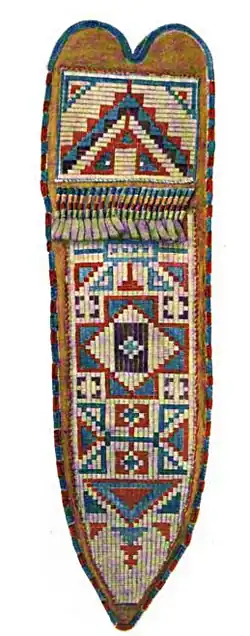 Les femmes s'adonnant à l'ornementation en piquants de porc-épic jouissaient également d'un statut spirituel et religieux particulier chez les Arapahos et les Outaouais, car leurs œuvres représentaient des êtres sacrés et des liens avec la nature. Les couleurs et les formes avaient également des significations uniques[12]. Les Outaouais en particulier utilisaient bon nombre des mêmes couleurs que les Pieds-Noirs, avec l'ajout de blanc, de jaune, de violet et d'or[13].