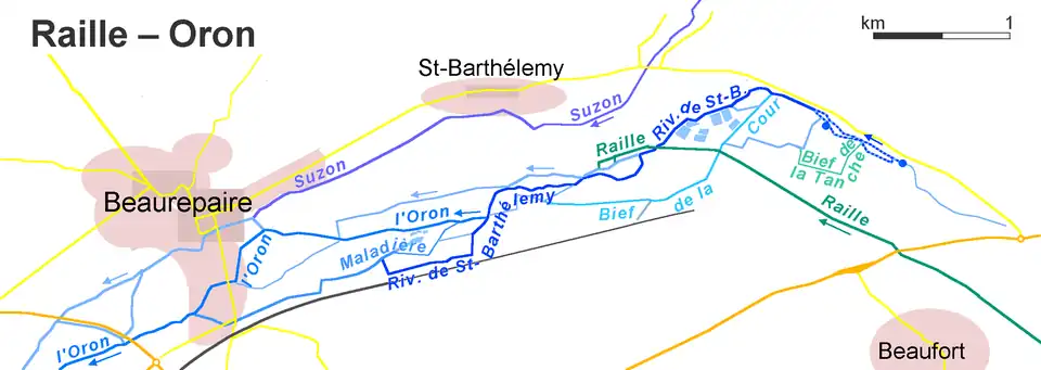 - la Raille (rg[note 1]) 35 km, sur treize communes, avec neuf affluents et de rang de Strahler trois[5].