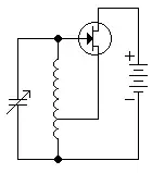 L'oscillateur Hartley est le circuit miroir de l'oscillateur Colpitts qui utilise un diviseur de tension composé de deux condensateurs plutôt que de deux inductances. Bien qu'il ne soit pas nécessaire qu'il y ait un couplage mutuel entre les deux segments de bobine, le circuit est généralement mis en œuvre en utilisant une bobine à prise, avec la rétroaction prise à partir de la prise, comme indiqué ici. Le point de raccordement optimal (ou le rapport des inductances des bobines) dépend du dispositif d'amplification utilisé, qui peut être un transistor bipolaire, un FET, une triode ou un amplificateur de presque n'importe quel type (non inverseur dans ce cas, bien que des variantes du circuit avec un point central mis à la terre et une rétroaction d'un amplificateur inverseur ou du collecteur/drain d'un transistor soient également courantes), mais un JFET ou une triode sont souvent utilisés car un bon degré de stabilité de l'amplitude (et donc de réduction de la distorsion) peut être obtenu avec une simple combinaison résistance-capacité de fuite de grille en série avec la grille grâce à la conduction de la diode sur les pics du signal qui crée une polarisation négative suffisante pour limiter l'amplification.