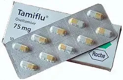 L’oseltamivir (Belgique et Suisse) ou oséltamivir (France) est un médicament antiviral, délivré oralement, utilisé pour le traitement, la prévention des grippes A et B. Il est distribué sous la marque Tamiflu. Selon une étude publiée en 2015, ce médicament réduit aussi les risques de complication[2]. Il est produit à partir d'acide shikimique, un inhibiteur de la neuraminidase, l'enzyme présente en surface du virus qui attaque les parois des cellules à contaminer.