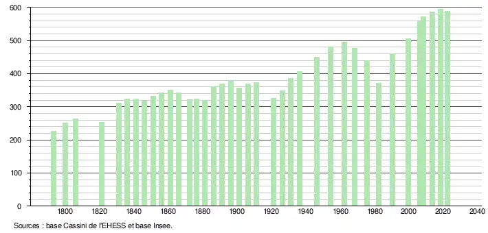 L'évolution du nombre d'habitants est connue à travers les recensements de la population effectués dans la commune depuis 1793. Pour les communes de moins de 10 000 habitants, une enquête de recensement portant sur toute la population est réalisée tous les cinq ans, les populations de référence des années intermédiaires étant quant à elles estimées par interpolation ou extrapolation[19]. Pour la commune, le premier recensement exhaustif entrant dans le cadre du nouveau dispositif a été réalisé en 2008[20].