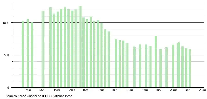L'évolution du nombre d'habitants est connue à travers les recensements de la population effectués dans la commune depuis 1793. Pour les communes de moins de 10 000 habitants, une enquête de recensement portant sur toute la population est réalisée tous les cinq ans, les populations de référence des années intermédiaires étant quant à elles estimées par interpolation ou extrapolation[18]. Pour la commune, le premier recensement exhaustif entrant dans le cadre du nouveau dispositif a été réalisé en 2007[19].