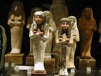 Ces statuettes représentent les serviteurs funéraires qui devaient répondre[note 1] à l’appel d’Osiris et remplacer le mort dans les travaux des champs de l’au-delà.
