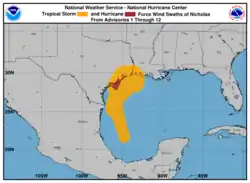 À 3 h UTC le 14, le NHC a rehaussé Nicholas au niveau d'ouragan de catégorie 1 à la suite du rapport d'une station météorologique dans la baie de Matagorda qui signala des vents soutenus de 66 nœuds (122 km/h) avec rafales à 83 nœuds (154 km/h)[6]. Il était alors à 30 km au sud-est de Matagorda (Texas)[7]. À 5 h 30 UTC, le système à touché la côte sur l'est de la péninsule de Matagorda et a ensuite suivi la côte juste à l'intérieur dans les terres, redevenant une tempête tropicale et ralentissant son déplacement durant les heures suivantes[8].