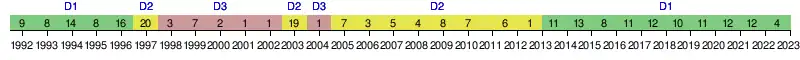 | 1982 | 9e | 31 | 32 | 12 | 7 | 13 | 37 | 47 | -10 | ||