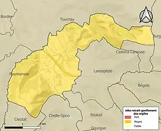 Le retrait-gonflement des sols argileux est susceptible d'engendrer des dommages importants aux bâtiments en cas d’alternance de périodes de sécheresse et de pluie. La totalité de la commune est en aléa moyen ou fort (44,5 % au niveau départemental et 48,5 % au niveau national). Sur les 151 bâtiments dénombrés sur la commune en 2019, 151 sont en aléa moyen ou fort, soit 100 %, à comparer aux 75 % au niveau départemental et 54 % au niveau national. Une cartographie de l'exposition du territoire national au retrait gonflement des sols argileux est disponible sur le site du BRGM[30],[Carte 2].