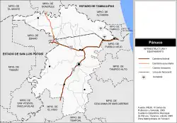 - Une voie de chemin de Fer partant de l'État de San Luis Potosí à l'ouest et desservant la ville de Tampico à l'est la traverse d'ouest en est, légèrement au nord de la route nationale 70.