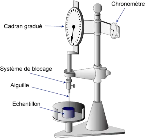 - un pénétromètre, dispositif permettant à un porte-aiguille de se déplacer verticalement sans frottement mesurable, et permettant la détermination de la pénétration de l’aiguille au dixième de millimètre près. Le porte-aiguille doit pouvoir se démonter facilement du dispositif, et peser 47,50 g. Il faut prévoir une masse additionnelle de 50,00 g pouvant se fixer sur le porte-aiguille si elle n’existe pas déjà. Ceci porte le poids de l’ensemble à 100 g ;