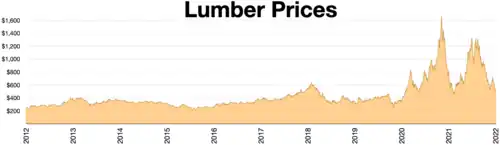 En mai 2021, aux États-Unis, le prix du bois d'œuvre a atteint un sommet historique à 1 686 $ par millier de pieds-planche, soit une augmentation de 406 % par rapport aux 333 $ négociés à la même période l'an dernier. En conséquence, le prix d'une nouvelle maison unifamiliale a augmenté de près de 36 000 $, selon la National Association of Home Builders (en)[2],[3], mettant les maisons hors de portée de certains foyers[4].