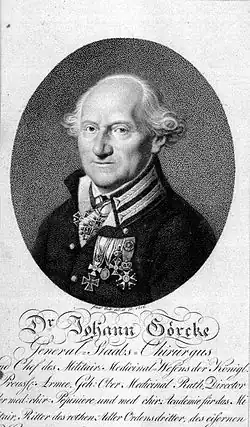 Après la bataille de Valmy (1792), le roi de Prusse Frédéric-Guillaume II reconnaît le retard de la médecine militaire de l'armée prussienne et ordonne la fondation d'une école de médecine militaire d'élite à Berlin. Les futurs chirurgiens doivent y recevoir une formation scientifique, militaire et sportive. Le cursus est gratuit et les étudiants (appelés élèves[3]) y reçoivent logis et couvert[4]. Ceux-ci sont surnommés les « coqs siffleurs » (Pfeifhähne), expression employée à l'origine par les garçons des rues berlinois. Le succès de l'école est immédiat : sur dix candidats, il n'y peut avoir qu'un admis.