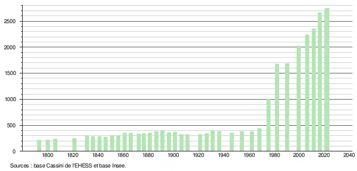L'évolution du nombre d'habitants est connue à travers les recensements de la population effectués dans la commune depuis 1793. Pour les communes de moins de 10 000 habitants, une enquête de recensement portant sur toute la population est réalisée tous les cinq ans, les populations de référence des années intermédiaires étant quant à elles estimées par interpolation ou extrapolation[25]. Pour la commune, le premier recensement exhaustif entrant dans le cadre du nouveau dispositif a été réalisé en 2006[26].