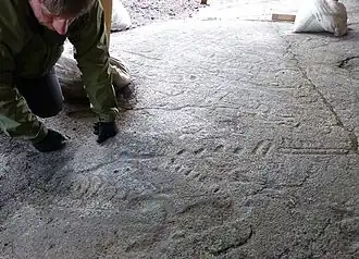 L'archéologue Evguenii Kolpakov sur le principal rocher à pétroglyphes de Kanozero