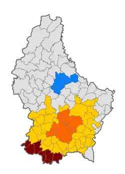 - CDA d'ordre régional : Clervaux, Differdange, Dudelange, Grevenmacher, Junglinster, Mersch, Redange-sur-Attert, Remich, Steinfort, Vianden et Wiltz.