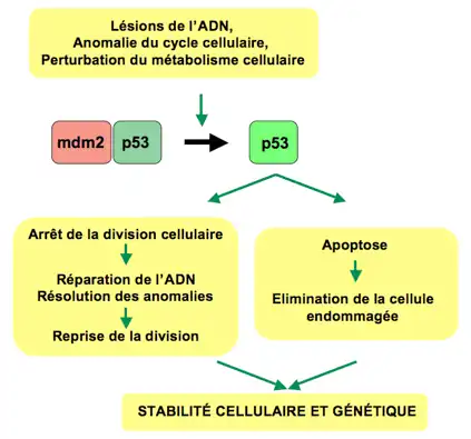La fonction première de la protéine p53 est d’agir en tant que facteur de transcription. Elle fonctionne en se fixant de manière spécifique sur les régions régulatrices de gènes dont elle contrôle l’expression. Dans une cellule normale, en l’absence de tout stress, il n’y a que très peu de p53, car celle-ci n’est pas nécessaire au fonctionnement de la cellule. Cette absence de p53 est due à l'enzyme mdm2, une E3 ubiquitine ligase qui, en se fixant sur p53, induit sa destruction. Lorsque la cellule se trouve en situation de stress, l’association entre p53 et mdm2 est abolie ce qui conduit à une augmentation de la quantité de p53 dans la cellule. Cette première phase est nommée « phase d’activation ». De nombreux types de stress sont capables d’activer la p53 comme les lésions de l’ADN, les défauts de division ou de métabolisme cellulaire.