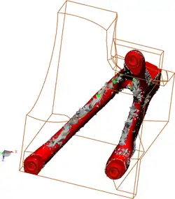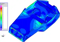- Domaines d’application majeurs : rigidité, résistance, contact, analyse thermomécanique[7], vibration[8], acoustique[9], dynamique du rotor[10], stabilité (crissement des freins[11] par exemple), température et champs électromagnétiques