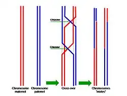 Le processus d'enjambement. Les chromatides maternelles sont en rouge et les paternelles en bleu. Les pointillés figurent les sutures.