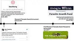 Deux prix de recherche sur les parasites sont décernés pour récompenser les scientifiques qui ont apporté des contributions exceptionnelles et rigoureuses à l'analyse des données secondaires en biologie. Les destinataires doivent réutiliser les données générées par quelqu'un d'autre pour étendre, reproduire ou réfuter une étude de recherche de manière reproductible. Le prix du parasite junior reconnaît la contribution exceptionnelle d'un scientifique en début de carrière, tel qu'un stagiaire postdoctoral, diplômé ou de premier cycle. Le prix de parasitisme senior reconnaît une personne qui s'est engagée dans une recherche exemplaire sur le parasitisme pendant une période prolongée. Depuis le lancement du prix en 2017[9], une bourse de voyage pour assister au Pacific Symposium on Biocomputing a été offerte au jeune lauréat du prix parasite par GigaScience[10]. À partir de 2019, les prix sont financés en partie par une dotation de l'Université de Pennsylvanie.