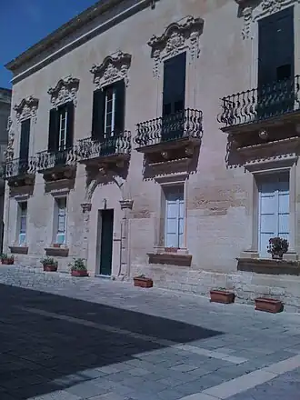 L'aile principale de l'hôtel est du XVIe siècle, des agrandissements ultérieurs des XVIIe et XVIIIe siècles, appartenant au caractéristique style baroque leccese. Sur la façade du XVIIIe siècle les hautes fenêtres du premier étage au style rococo, les balcons en fer forgé élégamment ciselés et son portail catalan-durazzesque donnent à l'ensemble un air espagnol. La disposition de espaces intérieurs ainsi que l'escalier d'honneur datent également de cette époque.