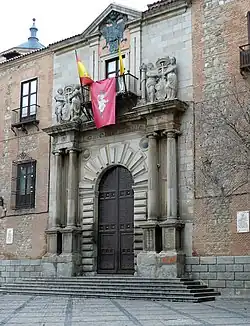 Les portails sont intéressants, dont le principal donnant sur la Plaza del Ayuntamiento. Les ailes le bordant sont composées de brique et de pierre, mais le centre est en pierre lisse avec un tympan triangulaire. Le petit balcon supérieur en fer est flanqué de nymphes sculptées tenant les armoiries du cardinal. Le tympan est orné de l'aigle double des Habsbourg, décoré dans le style maniériste avec des colonnes couplées[1].