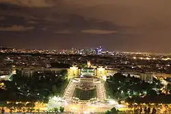 Lors de l'exposition de 1937, les pavillons des puissances invitées sont installés dans les jardins. Celui de l’URSS, du côté de l'aile de Passy, comporte la statue L'Ouvrier et la Kolkhozienne de la sculptrice Vera Moukhina ; en face, celui de l'Allemagne du Troisième Reich est surmonté d'un « aigle doré juché sur [une] croix gammée », et a été conçu par Albert Speer[29]. Dans la perspective du palais et de la tour Eiffel, située sur la place du Trocadéro, s'élève la Colonne de la paix, réalisée par Albert Laprade[29]. Pour la première fois, l'électricité est utilisée de façon massive, créant ainsi une attraction nocturne appréciée sur la colline de Chaillot[30].