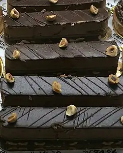 Cette recette nécessite des blancs d'œufs montés en neige et serrés avec du sucre, on fait cuire au four, puis on ajoute du praliné fondu au bain-marie et du beurre de cacao auxquels on ajoute la feuilletine que l'on fait cuire au four pour qu'elle devienne craquante[2]. Une fois le biscuit et la mousse au chocolat obtenus, on découpe deux biscuits en cercle (le plus fréquent), ou en rectangle, que l'on met au-dessus et en dessous de la mousse au chocolat. On rajoute une couche de chocolat au-dessus que l'on lisse à la spatule. On peut décorer le dessus avec un cerneau de noix, ou de la poudre de noisette.