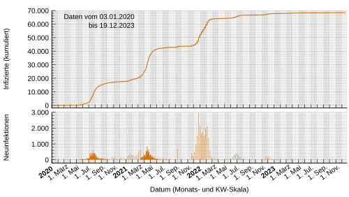 Au 31 décembre 2021, le nombre total de cas et de 52 434, celui de guérisons est de 45 985 et celui de décès est de 1 067[11].