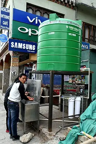 Station autonome de lavage des mains pour prévenir le coronavirus à Thimphou, en .