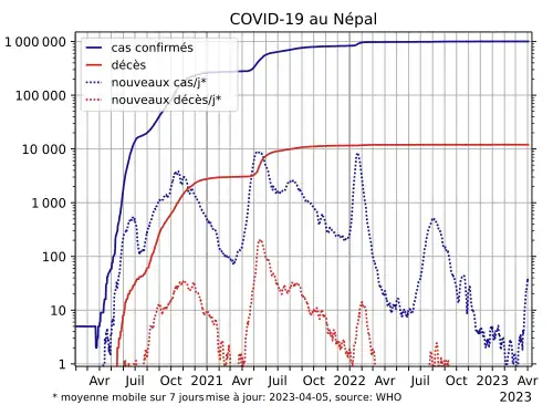 La pandémie de Covid-19 au Népal démarre officiellement le . À la date du , le bilan est de 12 019 morts.