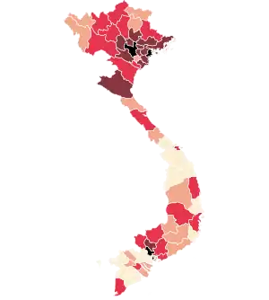 Depuis la fin , le Vietnam connaît « une épidémie à propagation rapide » de plus de « 700000 » cas. Des groupes de cas sont découverts dans les parcs industriels de la province de Bắc Giang et dans au moins dix grands hôpitaux du pays[52],[53]. Selon l'OMS, le Vietnam a construit plus de 30 hôpitaux de campagne avec 1 500 lits de soins intensifs et 30 000 lits de soins non intensifs. Lorsque le nombre total de cas a atteint plusieurs milliers par jour, le gouvernement a confiné le sud du Vietnam et Hanoï[54],[55]. Le , pour la première fois dans l'histoire de la prévention de la maladie au Vietnam, Hô Chi Minh-Ville a imposé un couvre-feu quotidien à 18 heures ; personne ne pouvait quitter la ville et seuls les services d'urgence étaient autorisés à fonctionner[56],[57]. Le 28 juillet, l'Assemblée nationale a autorisé le gouvernement central à mettre en œuvre des mesures d'urgence locales pour enrayer la pandémie[58]. Le 20 août, Nguyễn Thành Phong a été démis par le Politburo de ses fonctions de président du Comité populaire d'Hô Chi Minh-Ville[59]. Le gouvernement a également envoyé 10 000 soldats dans la ville pour faire respecter le confinement et livrer de la nourriture[60],[61],[62]. L'une des principales causes de l'épidémie a été un congé de quatre jours pour la Journée de la réunification et la Journée internationale des travailleurs, au cours duquel de nombreuses destinations de vacances ont été bondées de voyageurs[63],[64],[65],[66]. Le séquençage de l'ADN a indiqué que le variant Delta du SRAS-CoV-2 a dominé cette vague, en particulier dans le centre et le sud du Vietnam[67].