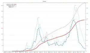 L'évolution de l'épidémie dans le pays fluctue en fonction des différentes mesures prises pour limiter l'évolution du coronavirus[2].