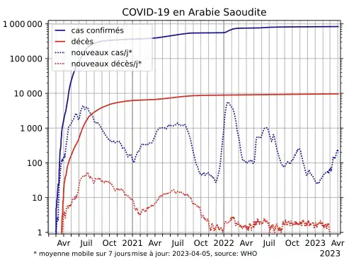 La pandémie de Covid-19 en Arabie saoudite démarre officiellement le . À la date du , le bilan est de 9 400 morts.