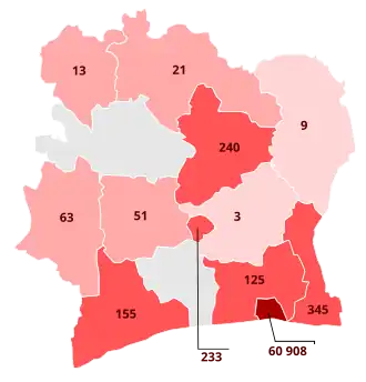 - Le , 62 nouveaux cas ont été confirmés et quatre autres patients guéris. Sur les 62 nouveaux cas, 58 étaient à Abidjan et quatre à Adiaké. Le ministre de la Défense Hamed Bakayoko a annoncé qu'il était l'un des cas confirmés[31]. Depuis le début de l'épidémie, 323 cas ont été confirmés, dont 41 se sont rétablis et trois sont décédés. Le Ministère de la Santé et de l'Hygiène Publique a publié une liste de sites, à Abidjan et alentours pour les tests : Yopougon, Abobo, Marcory, Koumassi et Port-Bouët ; traitement : Treichville, Cocody, Grand-Bassam, Yopougon, Abidjan et Anyama ; mise en quarantaine (Marcory) ; et pour analyse (Institut Pasteur d'Abidjan). Cette annonce a provoqué de violentes manifestations à Youpogon et Koumassi[32].