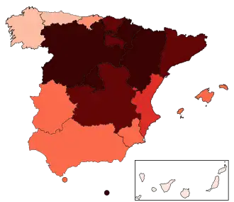 - Au , il y a 643 cas confirmés de Covid-19, 17 morts et 30 guérisons. La maladie progresse rapidement en 24 heures, le le royaume d'Espagne compte 909 cas, 25 morts et 32 guérisons[23]. Au Pays basque, le nombre des personnes atteintes est passé de 102 à 149 le en 24 heures. Cette région est la plus touchée après celle de Madrid où ce chiffre a plus que doublé en 24 heures, passant de 202 à 469[24].