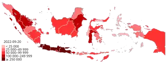 La pandémie de Covid-19 s'est propagée en Indonésie à partir du , lorsqu'un professeur de danse et sa mère ont été infectés par un ressortissant japonais[1],[2]. Le , la pandémie s'est propagée à toutes les provinces d'Indonésie après que Gorontalo a confirmé son premier cas, Jakarta, Java occidental et Java oriental étant les provinces les plus touchées.