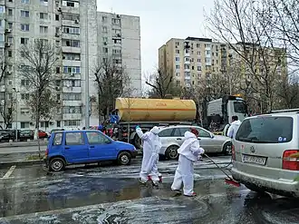Au , des mesures restrictives sont prises, la fermeture de toutes les écoles et crèches du 11 au (certaines universités répercutent aussi cette décision) et la suspension de tous les transports routiers ou ferroviaires vers ou depuis l'Italie jusqu'au . Le jeudi , le ministre de la Santé Victor Costache démissionne en invoquant des raisons personnelles et professionnelles. Il avait été mis en cause pour sa gestion de l'épidémie[10].