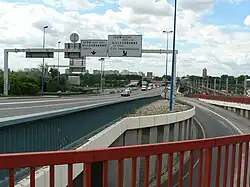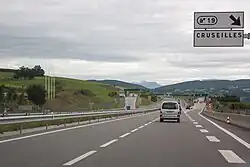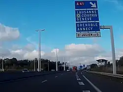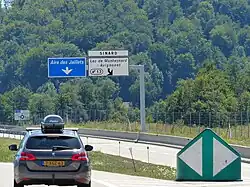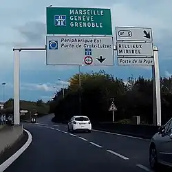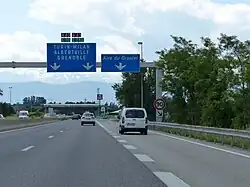 | D31f | Bifurcation autoroutière | Bleu | Numéro de la voie inscrit dans un encart dont la couleur est liée au statut de la route concernée | ![]() |
