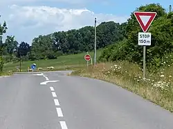 Lorsqu'un carrefour comporte une présignalisation réalisée à l'aide de panneaux diagrammatiques D42 ou D43 placés à 150 m de l'intersection, le panneau de signalisation avancée d'intersection est placé après le panneau D42 généralement à 100 m avant le carrefour