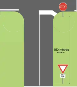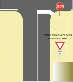 Lorsqu'un de ces panneaux est placé à plus de 200 m d'une intersection, il doit être répété à mi-distance environ de celle-ci et les deux panneaux doivent être complétés par un panonceau de distance.