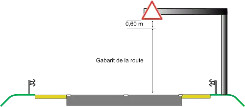 Lorsque les panneaux sont sur portique, potence ou haut-mât au-dessus de la chaussée, ils sont fixés à une hauteur minimale correspondant au gabarit de la route auquel s'ajoute une revanche de 0,1 mètre pour l'entretien de la chaussée et une revanche de 0,50 mètre pour la protection de la signalisation.