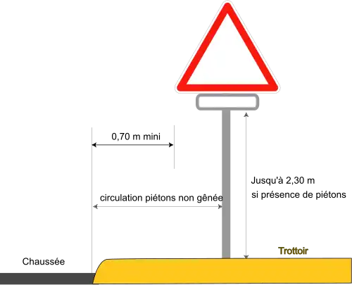 La hauteur réglementaire[8] est fixée en principe à 1 mètre (si plusieurs panneaux sont placés sur le même support, cette hauteur est celle du panneau inférieur), hauteur assurant généralement la meilleure visibilité des panneaux frappés par les feux des véhicules.