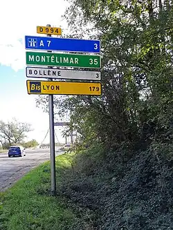 - Panneaux de présignalisation de type D40 : Ils annoncent les directions desservies à la prochaine bifurcation, au prochain échangeur ou au prochain carrefour. Ils annoncent également les villages étape, aires de repos et péages.