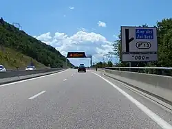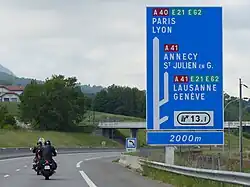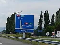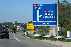 | D52a | Bifurcation autoroutière simple | Bleu | Représentation de l'embranchement de manière simplifiée. Chacune des deux branches autoroutières, terminée en pointe de flèche, est complétée par le numéro de l'autoroute concernée dans un encart rouge et par la ou les mentions caractérisant la direction. Un ou plusieurs encarts verts comportant un numéro d'itinéraire européen peuvent compléter, le cas échéant, le numéro des autoroutes. | Distance de la bifurcation. | ![]() |